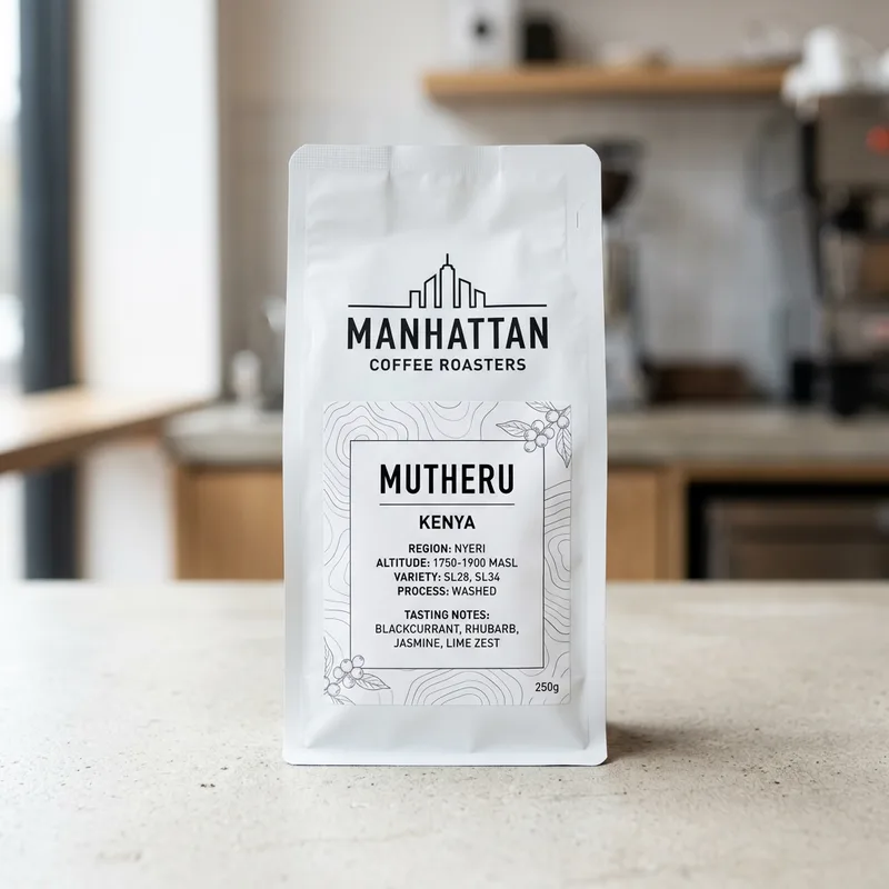 En exceptionel kenyansk kaffe fra Mutheru Factory, nu tilgængelig hos MCR! Beliggende på skråningerne af Aberdare Ranges modtager Mutheru Factory sine kirsebær fra over 500 landmænd, der hver forvalter omkring 250 træer. Med høje højder og konsekvente praksisser leverer den rene kaffer med en unik kenyansk profil. Dyrket i en højde af 1700 masl, denne blanding af klassiske kenyanske varianter Ruiru 11, SL-28 og SL-34 udmærkede sig ved sin elegante profil af rød solbær, gul blomme og let karamel. OBS: Billede er AI-genereret og ikke af det faktiske produkt.
